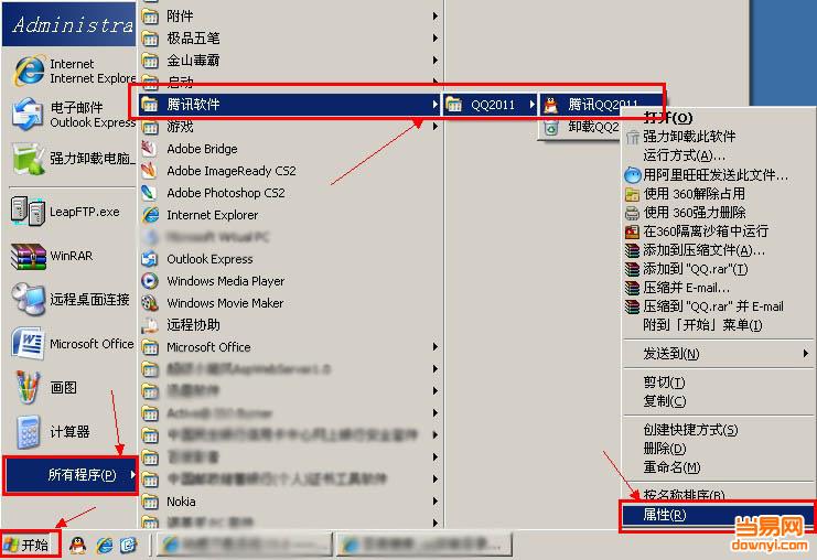 QQ默认的安装位置是:C:\Program Files\Tencent\QQ文件夹。如果您的QQ没有安装在这个位置,可以这样来看它安装在哪。“开始”菜单-->“所有程序”-->“腾讯软件”-->“QQ2011”-->“腾讯QQ2011”,找到这一项后,在此项上单击鼠标右键,然后从快捷菜单中选择“属性”。