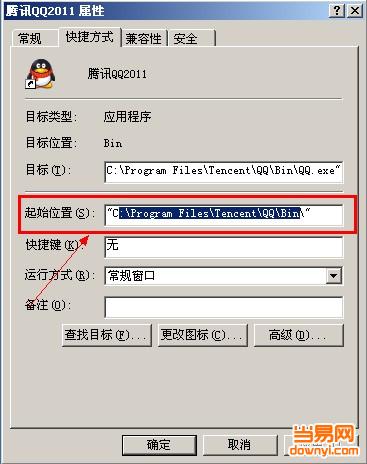 在“腾讯QQ2011属性”窗口“快捷方式”选项卡下,“起始位置”后面的文本框里就是QQ的目录。另外,如果您的电脑上桌面上有QQ快捷方式,在上面单击鼠标右键,从快捷菜单里选择“属性”,也可以从打开的属性窗口里查看QQ安装的目录。