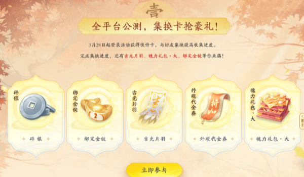 游戏于3月28日起开启全平台公测活动,活动登录就送侠侍卡,集齐兑换进度可以获得吉光片羽、魄力大礼包、金锭等奖励,更有绝品侠侍黄蓉等你来拿。