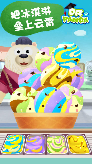 这是由一款为儿童开发的益智休闲游戏,制作属于你自己的冰淇淋!巧克力味?香草味?草莓味?还是混搭风味!?一切你说了算!在熊猫博士冰淇淋车里,你可以混合所有不同的风味,用饼干、巧克力和坚果等搭配出数百种不同的组合!舀冰淇淋球!小动物们最爱吃冰淇淋了,无论你给他们多少,他们都会咂咂嘴吃个一干二净。你可以用你舀的冰淇淋球堆成一座高耸小山或任何你喜欢的样子!加上丰富的配料!