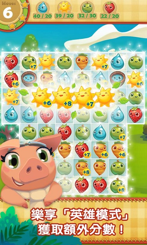 农场英雄传奇汉化版是一款非常受欢迎的农场风格的三消游戏,相比于传统三消游戏,这款当中确实带来的更多新的体验,不再是是简单的观察消除,而是添加了步骤数的限制,如果你收获的农作物超出了标准那就会会的额外的惊喜哦!快来体验吧!