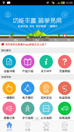 云图漫步手机版拥有轨迹回放、防盗报警、非法移动报警、电子围栏等等追踪功能,保障用户们夜间出行的安全。基于云网络及GPS全球定位系统、车载OBD系统所集成的物联网定位服务软件,提供目标设备实时导航及定位、轨迹回放、实时路况等服务,为您生活提供更优质实时准确导航服务。