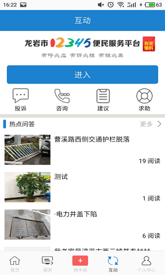 市民可通过手机掌握本市资讯,办理行政审批、查询医社保、公积金等账单,享受预约挂号、汽车订票等服务,实时归集龙岩要闻时讯、民生信息等动态信息,还可“随手拍”反映问题。不定期更新系统。