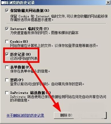 2.在删除面板中,我们勾选【历史记录】,然后点击【删除】如图所示