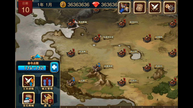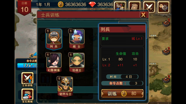 战斗胜利后我们有没有其他的事情可以做了呢?当然有了,我们可以发展城市,也就是说游戏分为战斗以及内政两个内容。其中发展城市有征兵、迁移、训练、开发、政治以及安抚这六个选项,征兵就是征募士兵,游戏中一共有五个兵种,其中低级兵种可以直接进行招募,高级兵种需要我们建造出相应的建筑才可以进行招募。此外游戏中每一次招募的数量都是有限制的,而且招募完成后还要冷却一段时间才可以继续进行招募,当然你可以使用宝石跳过冷却过程。