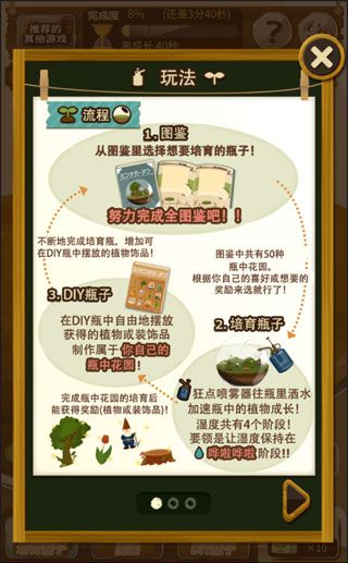 2、在小小的瓶子中创造花园吧,玩法介绍请看下方截图或点击游戏右上角的问号。