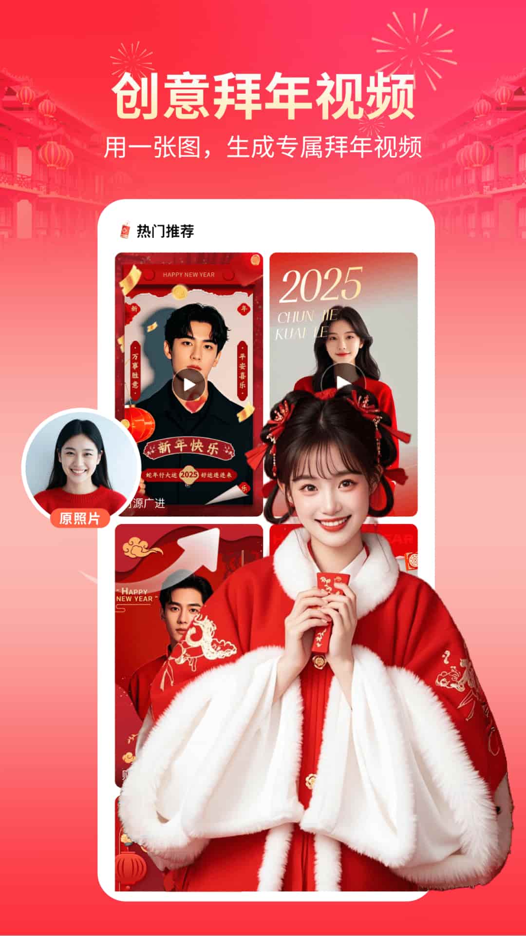新增「视频拜年」功能,只需一张图片即可轻松制作出吸引眼球的拜年视频,助您告别繁琐的妆搭过程。