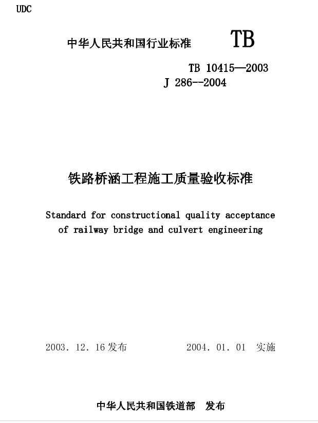 TB10415-2003标准是一份关于铁路桥涵工程施工质量验收的国家行业标准文档,其中详细的介绍了验收规范和建设规范,是铁路施工人员的必备参考文档资料,如有需要欢迎来下载试用阅读。