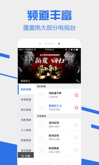 包含cctv5、cctv5+、cctv足球等央视频道,还包含广东体育、北京体育、风云足球等地方体育频道。提供覆盖篮球(nba,cba),足球(英超,西甲,德甲,意甲,中超,欧冠,亚冠,欧洲杯等)网球,排球等体育项目。