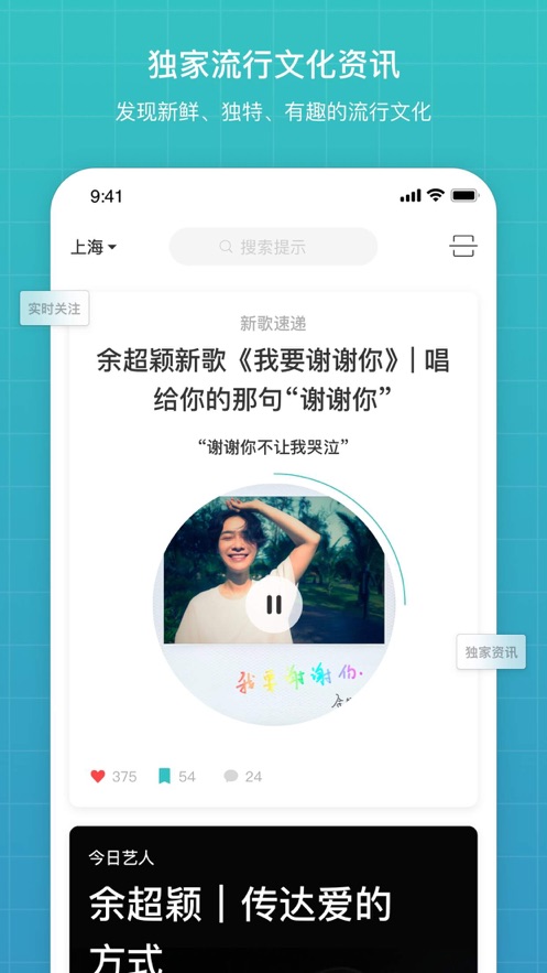 掌握艺人的第一手信息,关注追踪喜爱艺人的最新动态,收听最新单曲,观看演出视频。