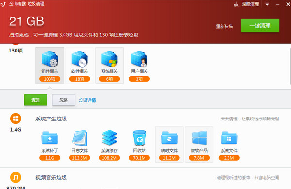 垃圾清理基于官方新毒霸正式版提取制作,无需依托毒霸环境也可独立运行。可对视频音乐垃圾、上网垃圾、设计软件垃圾、手机助手垃圾、其他软件垃圾、系统垃圾等等进行清理,能够提升电脑的运行速度。