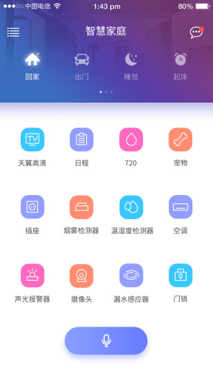 天翼高清电视、日程、720、宠物、插座、烟雾检测器、温湿度监测其、空调、声光报警器、摄像头、漏水感应器、门锁... ...
