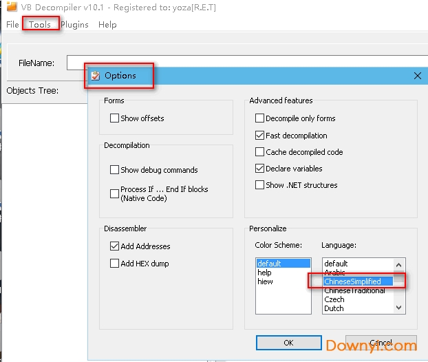 打开文件之后,点击tools,选择options,选中我红色方框勾选的地方,最后点击ok即可汉化,如下图: