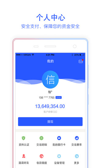 信汇通兼具多重支付功能的聚合支付软件,集合手机支付与生活应用为一体,通过加密传输和手机认证等安全保障体系,轻松实现当面付款、还款、转账汇款等多种业务,全力为中小微商户、移动商户、个人用户提供方便安全的多样性支付服务。