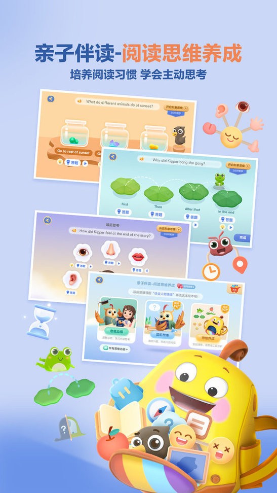 --打造10种集互动性、趣味性于一体的思维当易网导图,搭配高品质动画示范视频,鼓励孩子在阅读中积极思考,主动梳理和表达自己的观点,不断升级阅读技能;鉴于朗读流畅度与阅读理解程度密切关联,每本绘本均搭配三种出声朗读模式,并通过智能纠音提供及时反馈;