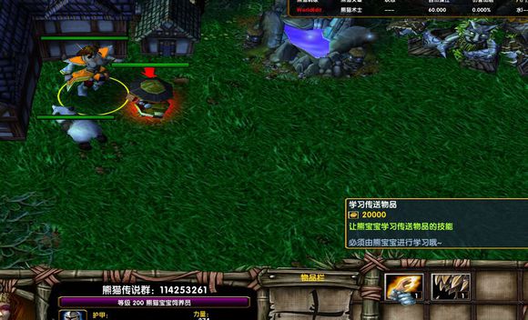 熊猫传说是个防守地图,跟其他防守地图一样,游戏目的是保护大殿不被一波一波的夹杂小BOSS的怪物摧毁,最后打败地图右下方的最终BOSS。玩家可以通过击杀波怪,去练功房打怪,打镜像以及打BOSS,合成装备,买属性书等形式增强自己的实力。其中的答题系统,还有抓鱼跟嘲讽两个小游戏增加地图的趣味。