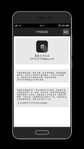 it代码社区app是一款供it从业者学习it技术的社区。对于it初学者来讲,代码是个很头疼的是,如果逻辑思维稍微差一点,那么学起来就很慢了。用it代码社区,让你在大神的指导下快速掌握基本知识,并且还能快速进阶。需要的朋友可以到当易网下载!