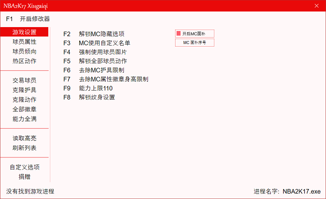 10051044:将原来的f2功能替换为zidingyi.txt中的“解锁mc隐藏选项”,添加伤病天数修改,“球员交易”功能现在禁止同队交易。
