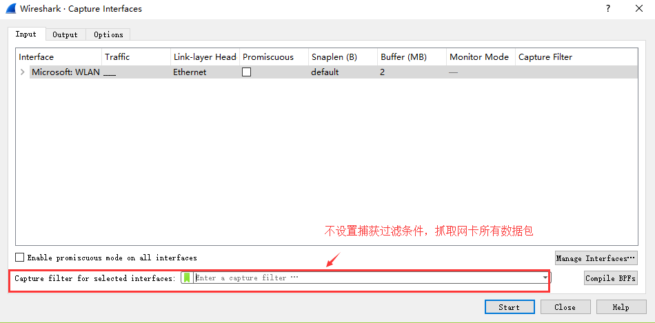 显示过滤器是用于在抓取数据包后设置过滤条件进行过滤数据包。通常是在抓取数据包时设置条件相对宽泛,抓取的数据包内容较多时使用显示过滤器设置条件顾虑以方便分析。同样上述场景,在捕获时未设置捕获规则直接通过网卡进行抓取所有数据包,如下