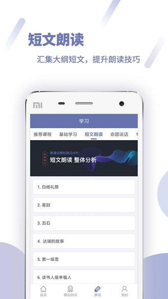 5. 短文朗读:提供普通话测试大纲短文朗读篇目和朗读范本,您可以反复听取朗读范本并进行朗读评测,在潜移默化中培养良好的朗读状态,准确把握作品的情感。
