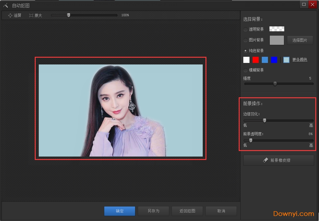 3、用选中笔/删除笔划线完后,可点击替换背景点击查看自己扣的图,如果不满意还可以点击“返回抠图”继续编辑。确认抠图完成可点击在右边的背景色来选择替换,这里有各种颜色可供选择也可以调取电脑存有的图片作为背景。在下方还可以对图像进行简单的前景操作,如边缘羽化、前景透明度等。