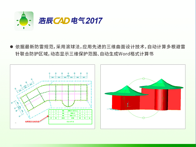 快速布置避雷针、同步校核被保护物任意高度的保护情况,直观显示保护范围。自动标注bx值,自动生成单根或多根避雷针的防护范围表,自动生成word格式计算书。生成三维图形动态观察。