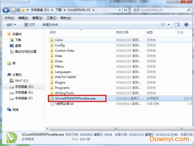 程序免安装和修改,但需简单的操作才可正常使用,具体方法:1、解压缩后,打开文件夹,运行“!)coreldrawx5porable.exe”开始安装