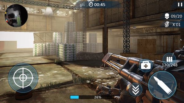 滑动左边屏幕控制角色移动,滑动右边屏幕移动准心,发现敌人的时候,点击瞄准按钮打开瞄准镜,点击射击发射子弹。右边的装备栏可以使用手榴弹和急救包等;