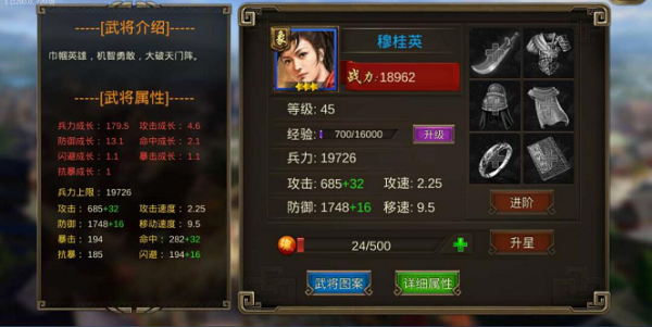 武将的属性包含兵力、攻击、防御、攻击速度、移动速度、暴击、抗暴、命中和闪避等属性。