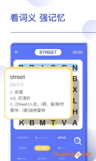 您可以向上、向下、向左、向右、甚至向右上、右下的方向划词找词哦。发挥你的眼力,学习单词!