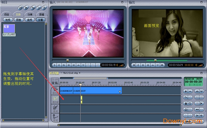 回到素材管理器这里,拖曳字幕文件到字幕轨道上使其生效,字幕轨道即第二条轨道,将字幕文件调整到对应的时间点,也可以拉长字幕轨,延长字幕的显示时间。在输出画面可以预览视频最终的效果。