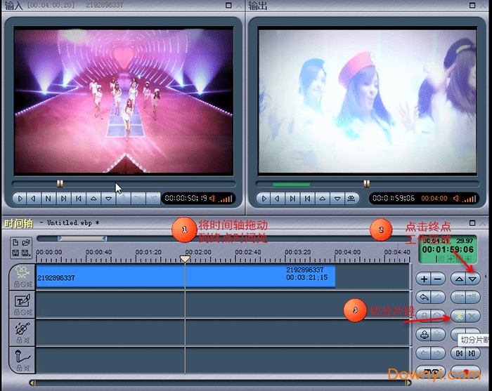 第二步继续移动时间轴浮标到截取的终点时间处,单击“设置工作区域终点”按钮,然后点击切分片段,剪切的终点就设置完成。再回头看视频轨道这里,视频已经被切分成三个片段了。