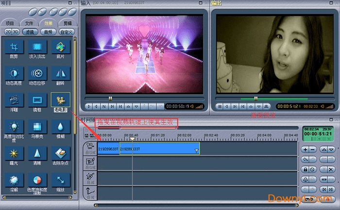 二、给视频添加特殊效果怎么做。步骤如下。选择项目这里的“效果”按钮,可以设置3d效果哦,单独需要3d效果的,可以用 3d电影制作软件,效果也是不错的。回到正题,以“老电影”效果为例,选中它,然后拖曳到对应的视频轨道上使其生效,视频片段右下角会有白色的标记,两个视频片段可以添加不同的效果,在输出画面可以预览视频效果。