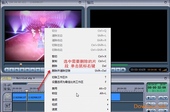 选中需要删除的片段,点击鼠标右键,选择“删除并清除空隙”,按照此方法可以删除全部不需要的视频片段。虽然删除了空隙,可以看到视频中间有一条缝隙,剩下的2个视频片段仍是独立存在的,可以单独进行编辑,这并不影响输出的视频,输出的时候会自动合并成一个视频。(两个视频中间不要留缝隙)。