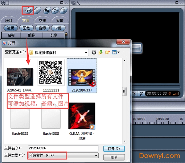 首先可以添加需要剪辑的视频,点击左上方的文件按钮,在添加文件类型这里下拉选择“所有文件”,选中文件“打开”就添加成功了,能添加视频、音频、图片文件,在左边项目这里可以看到添加的文件。