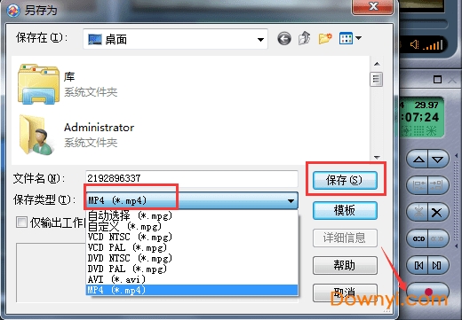 所有的编辑结束以后,就可以保存了 ,点击右下角的红色保存按钮,弹出另存为的画面,选择视频格式,支持mp4、avi、mpg格式,然后保存。