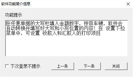 2、输入小写金额自动填写大写金额;自动填写大写日期;自动记忆最近使用的付款单位、付款行、付款账号下次使用同一票据时则自动填写;自动填写票据的存根。内置全国的省、市名称,省市关联,下拉选择即可。单位名称的字体和大写金额字体根据长度自动缩放。