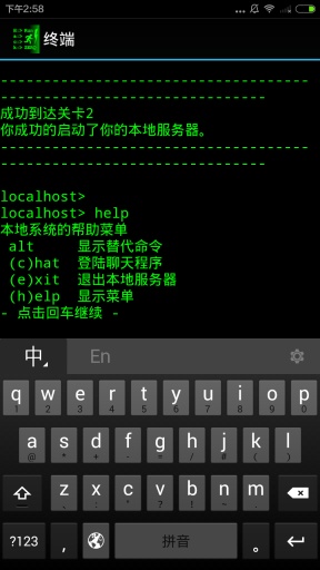 3.回到关卡2中的按照菜单显示的提示,输出chat登陆聊天程序,点击回车键即可到达关卡4。