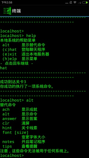 5.到达关卡5后玩家必须回头观察关卡4中的替代命令,输出hint关卡线索即会出现关卡线索,后输出alt替代命令中的ach显示成就,成就显示后会出现他们的回复;到达这里以后注意观察底下的提示说“命令无法被用于任何系统上”,因此可重新回顾前几关中来找线索,首先想到的是输出help显示主菜单;