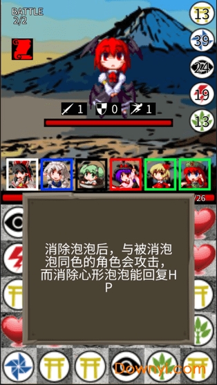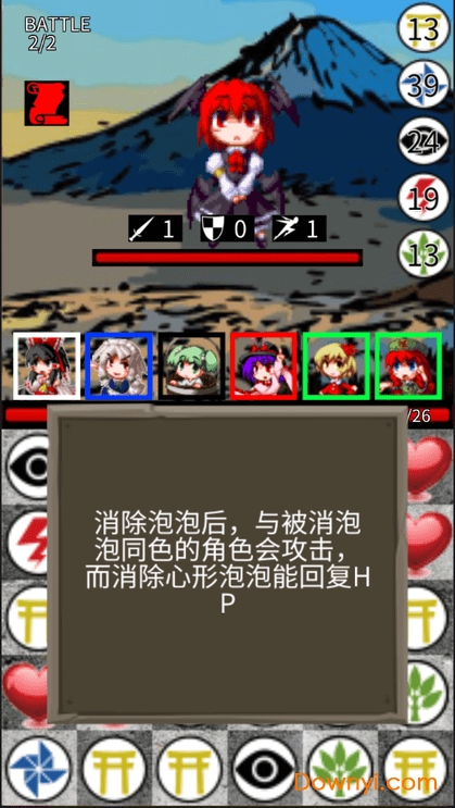 《东方三消乐》款极为新颖独特的东方同人大作,玩法是消消乐+万智牌的结合体,你可以用东方project的角色组成最多6人的队伍挑战各种关卡,关卡中的具体流程是:(施放卡牌技能→)移动泡泡→与所消泡泡同色的角色(卡牌)发动攻击→敌方攻击。