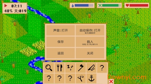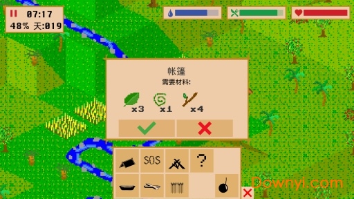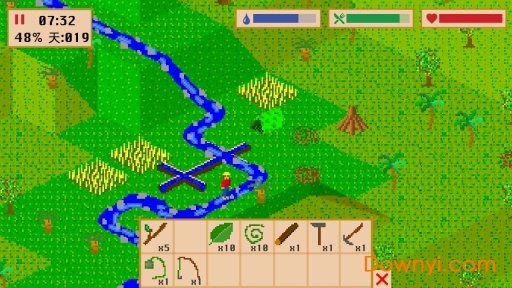 游戏结构简单,但基本的荒岛生存玩法都比较有趣:探索、采集、简单的组装道具,建设和求救等等。你需要不断地探索荒岛,收集一定数量和种类的物品然后自己做成工具、搭建帐篷、堆起篝火、制造树屋等等,不过在这期间你会消耗大量的水、食物和生命值,任何一个见底都会狗带。当然你可以寻找野果、种田和建设水渠,完成自我供养。