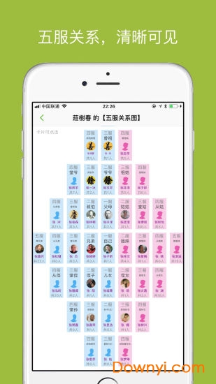 便捷浏览五服关系:用户可轻松切换中心人物,快速浏览其五服关系脉络,清晰了解家族成员之间的血缘关系。