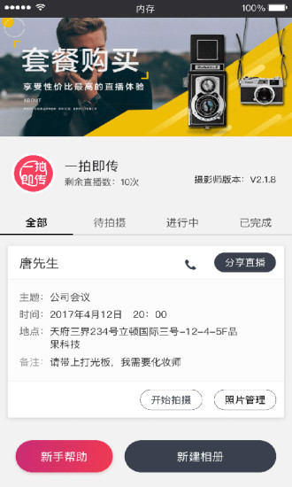 一拍即传由移动互联网著名摄影类品牌camera360出品,是款强大且易用的照片直播应用。它可以为摄影师提供高质量的照片直播功能,基于后端强大的图像处理能力,我们为摄影师提供超过130种滤镜功能,可以瞬间提升照片的品质,实现即拍照、即上传、即分享,帮助摄影师为客户提供满意的摄影服务体验。