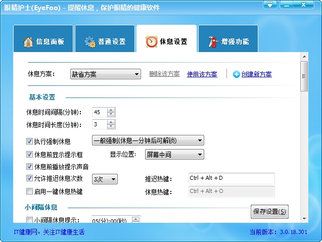 随着电脑的普及人们用电脑的时间越来越多,而由此产生了很多职业病,如近视眼,颈椎病,腰椎病。男性还有可能患上前列腺炎等。其实得这些毛病的根本原因就是持续用电脑时间过长。为了保护你的健康,你可以在你的电脑上安装眼睛护士软件,你可以设定工作时间和休息时间,这样在休息时间到来的时候,眼睛护士会锁定你的电脑,让你不能进行任何操作。从而进行休息,保护你的健康。眼睛护士作为一款健康保护软件,在锁定电脑时关闭显示器,从而节省电能。你也可以设定解除锁定时密码,和锁定状态下的背景音乐。