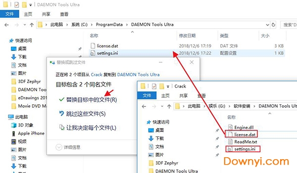 4、将修改补丁settings.ini和license.dat复制到C:\ProgramData\DAEMON Tools Ultra目录下替换源文件