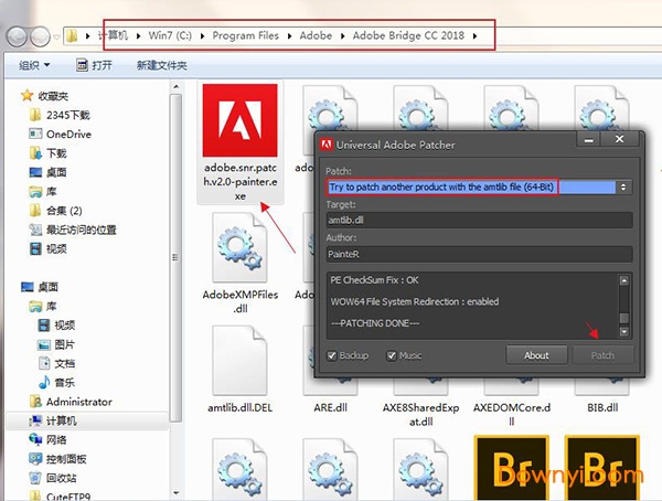 3、将数据包中解压出来的adobe.snr.patch.v2.0-painter.exe复制到上一步打开的目录下并运行,选中“Try to patch another product with the amtlib file (64-Bit)”然后点击右下角的patch即可