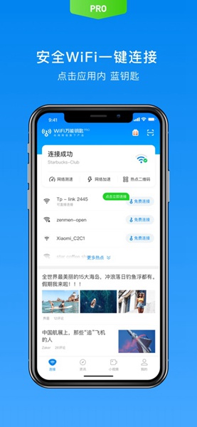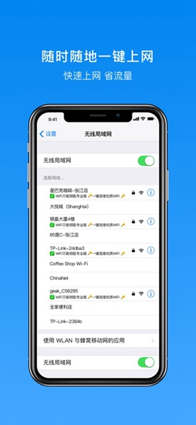 功能强大的手机wifi钥匙软件,提供安全上网服务,是一款用户真正的随身wifi管理工具,帮助你自动查询周边wifi热点信息,一键连接即可快速上网,是手机必备的安全上网工具。