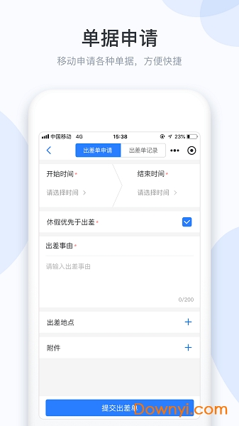 支持单据申请,请假单、出差单、加班单、销假单、签卡单