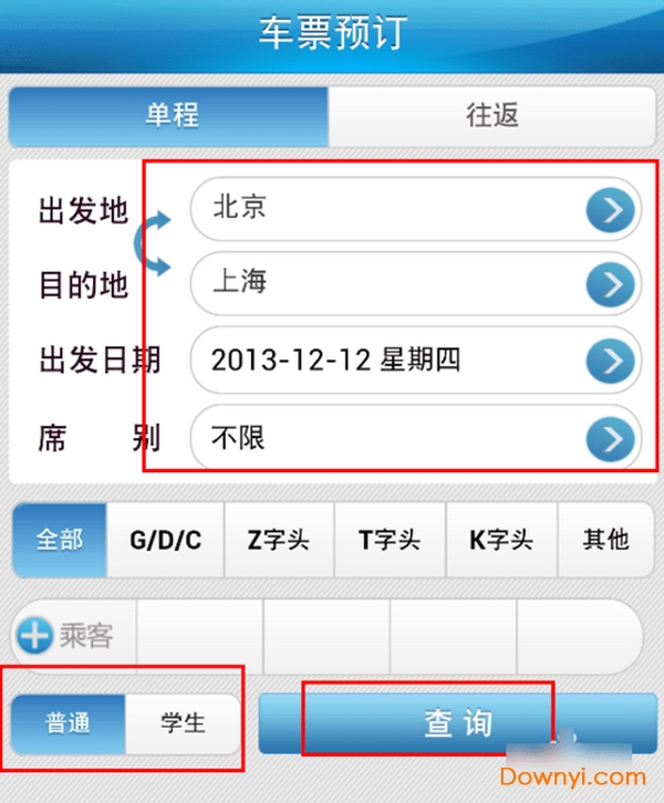 3、点击界面底部dock栏处的“车票预订”,开始订购车票。若您是单程购票,则在“单程”下选择出发地和目的地,并选择您的出发日期和席别。选择乘客类型(成人、学生),最后点击“查询”按钮查询余票情况。