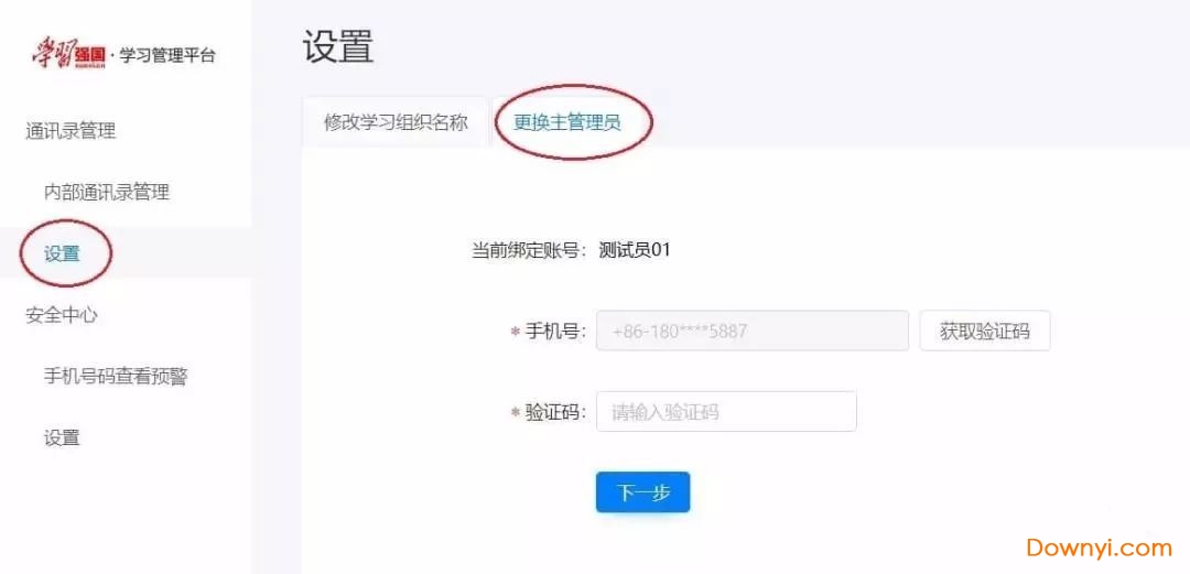 3、当前主管理员输入验证码,下一步完成更换操作。
